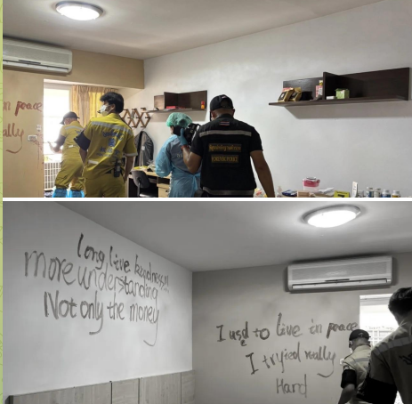 警方在勘查现场时,于死者租住的8层房间浴室内发现其21岁泰籍女友娜塔妮查的尸体。女方全身赤裸,颈部及全身多处受锐器重创,已死亡至少8小时。案发房间内打斗痕迹明显,墙上留有疑似用血书写的英文:“善良万岁!多些理解,不只是钱”及“我曾平静生活,我已尽力”。